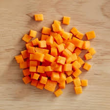 Potongan dadu kecil hasil dari julienne yang diiris kembali menjadi kubus kecil.
