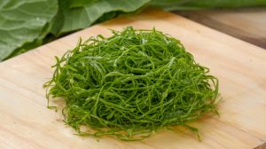 Daun digulung rapi lalu diiris halus agar hasilnya lembut dan cantik โ cocok untuk dekorasi dan topping makanan.